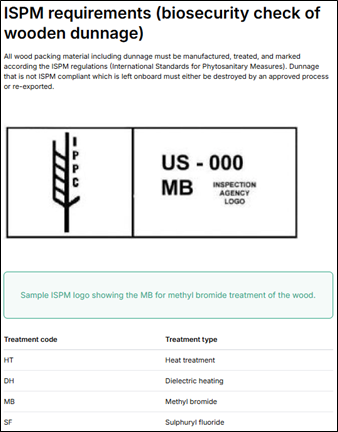 ISPM Requirements for treated wood / creates. dunnage loaded to vessels. Terminal > Clean cargo instructions > ISPM requirements (biosecurity check of wooden dunnage) Lesson Learned Reminder on this requirement